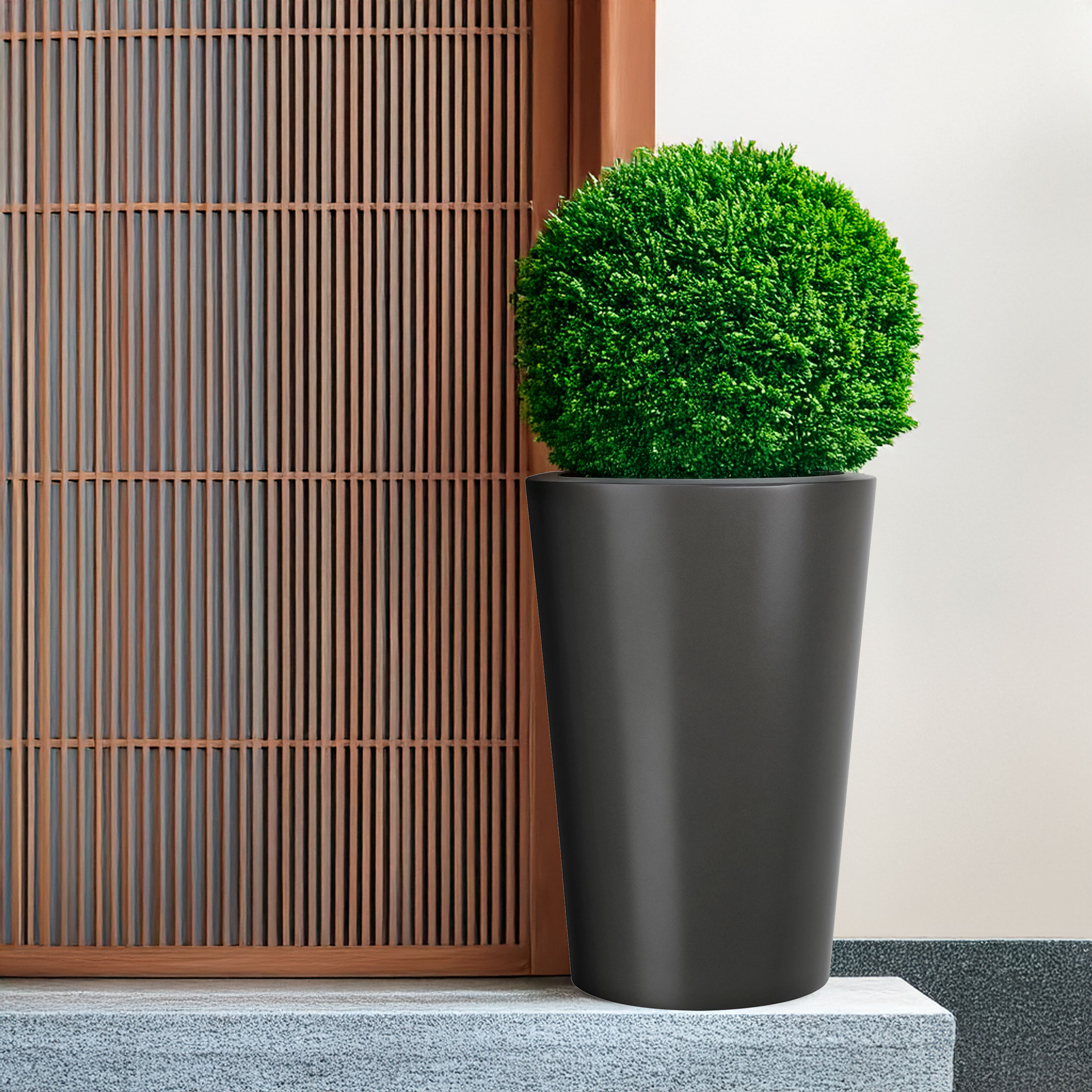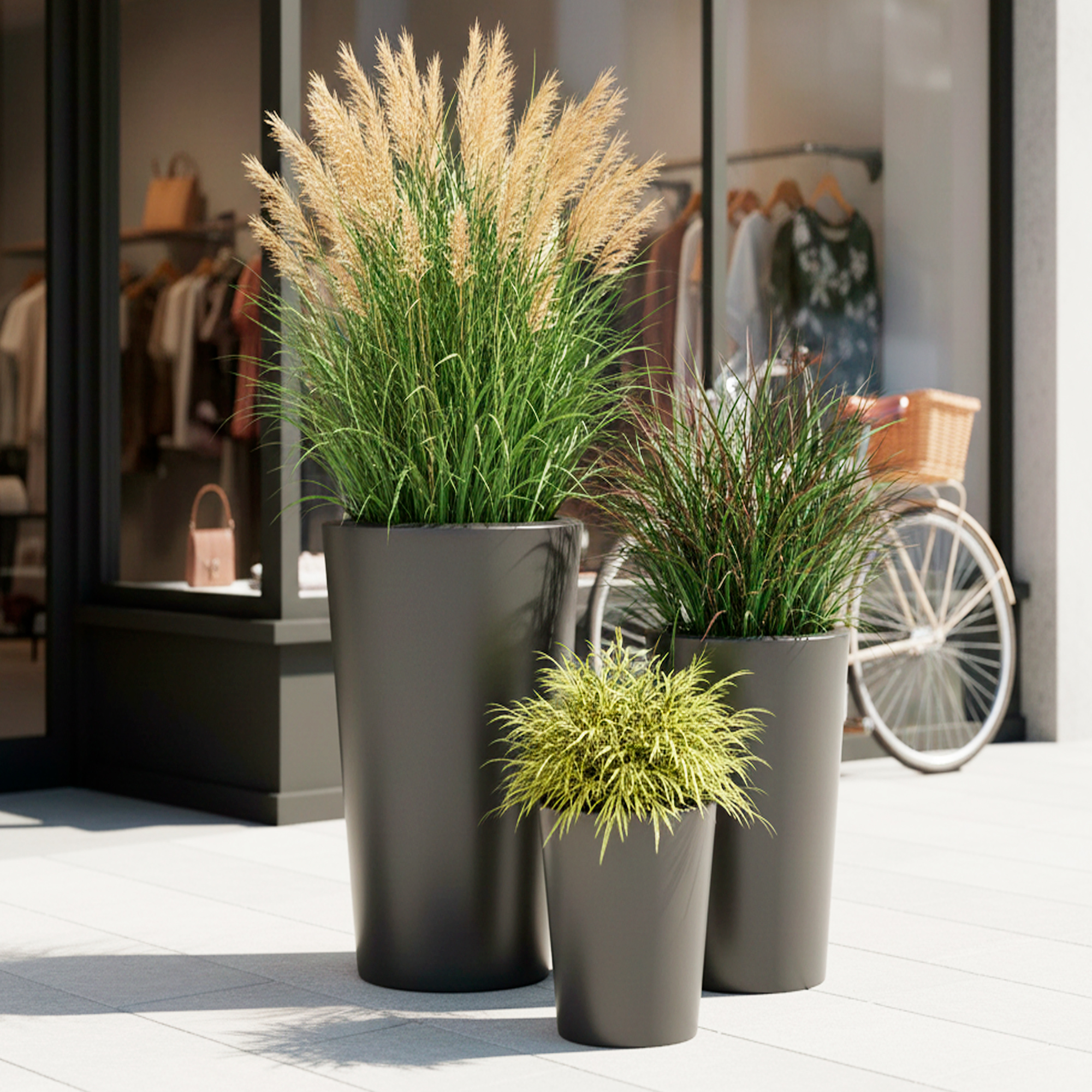 The Conical Planter can be customized to your preferred style with a choice of any RAL colour, available in finishes that range from smooth matt, satin, and gloss, to eye-catching metallic options. This makes it an ideal choice for any décor, effortlessly blending into both contemporary and more traditional environments. Whether indoors or outdoors, these planters elevate the ambiance with understated elegance.