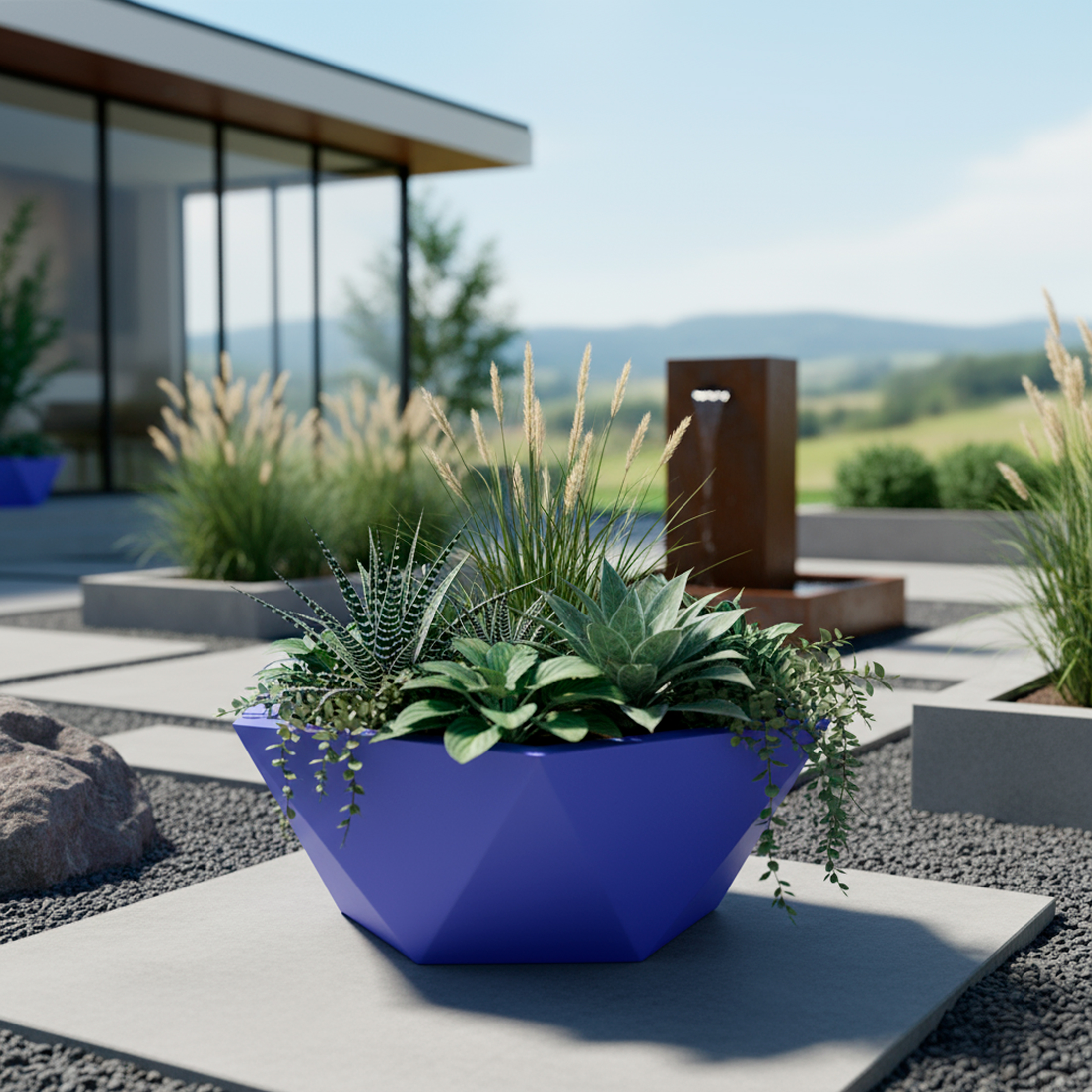 Following the trend of geometric and faceted shapes, the Hebden Bowl is a true statement piece. With its sleek, angular form, this planter is designed to catch the light beautifully, creating a dynamic and eye-catching focal point in any setting. Crafted from durable GRP, it is ideal for both interior and exterior planting.