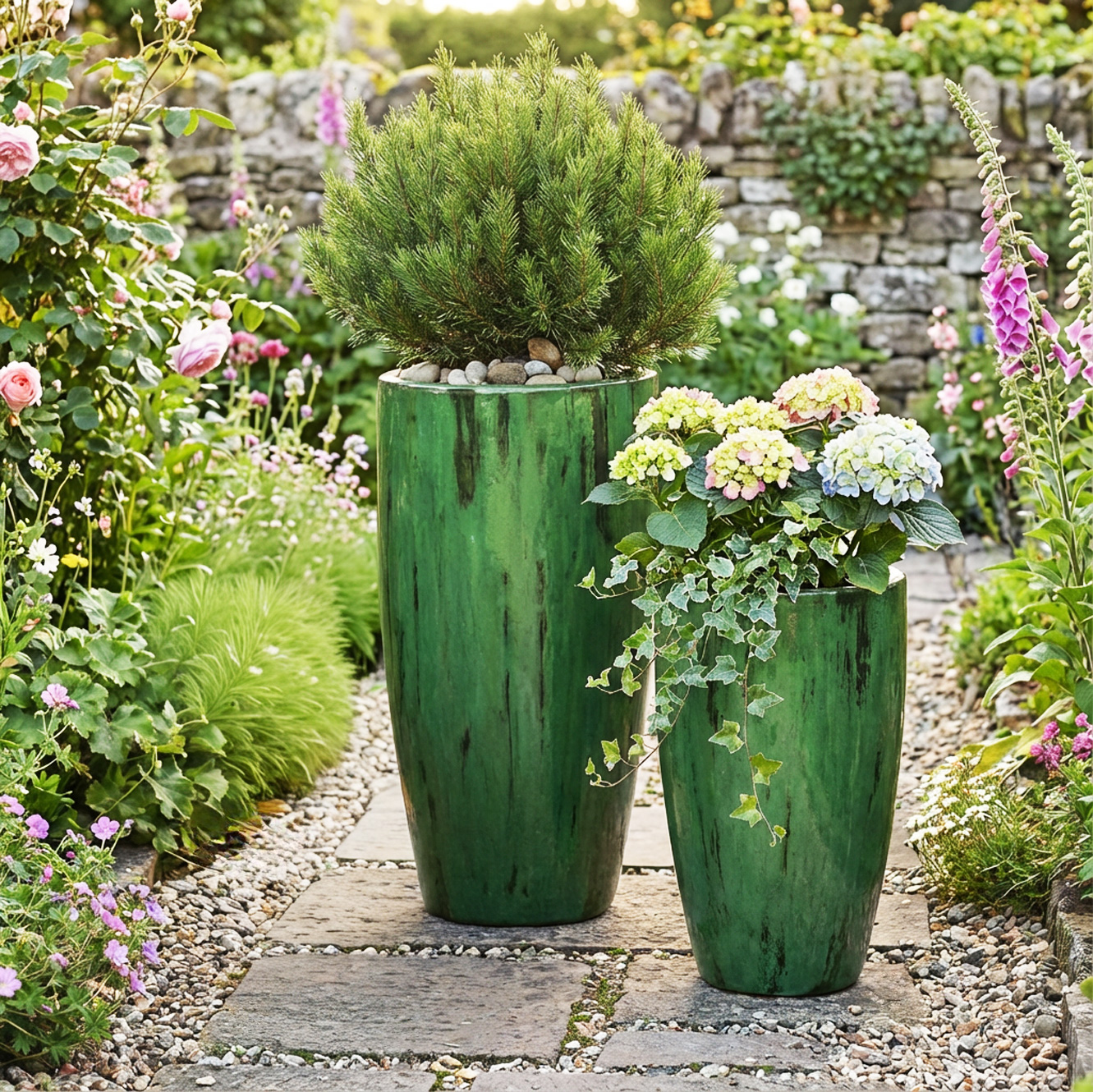 The Tapered Circle Planter shines in a variety of finishes, particularly in weeping effects or metallic colours, which give it a sophisticated, reflective quality that can transform any space. Available in a range of heights, it’s ideal for creating a dynamic, layered display when grouped together. Whether arranged as a trio of varying sizes or aligned in a row with the same height, this planter creates a striking visual impact and enhances the overall design of your garden, patio, or indoor space.